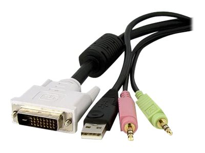Ce câble KVM DVI/USB 4 en 1 de 3 m offre une qualité vidéo DVI Dual Link avec une souris et un clavier USB, une sortie audio et une connexion pour microphone 3,5 mm en un seul câble compact.