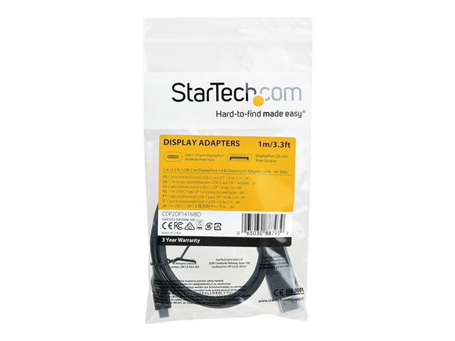 StarTech.com 3ft/1m USB C to DisplayPort 1.4 Cable 8K 60Hz/4K, Bidirectional DP to USB-C or USB-C to DP Reversible Video Adapter Cable, HBR3/HDR/DSC, USB Type C/Thunderbolt 3 Monitor Cable - 8K USB-C to DP Cable (CDP2DP141MBD) - Câble DisplayPort - 24 pin USB-C (M) pour DisplayPort (F) - USB 3.1 / Thunderbolt 3 / DisplayPort 1.4 - 1 m - actif, support pour 8K UHD (7680 x 4320) - noir