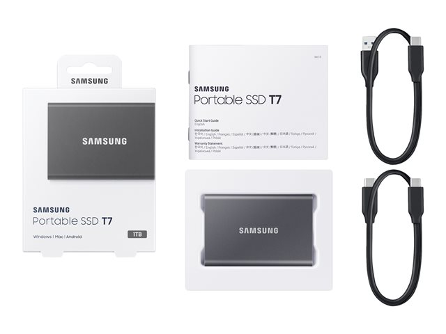 Samsung T7 MU-PC1T0T - SSD - chiffré - 1 To - externe (portable) - USB 3.2 Gen 2 (USB-C connecteur) - AES 256 bits - gris titan MU-PC1T0T/WW