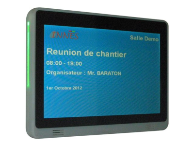 Le SignMeeting SMT210 est un écran de consultation de salle de réunion capable de s'interconnecter automatiquement à Microsoft Exchange, Lotus Domino, GRR, à des calendriers iCal ou à n'importe quel système propriétaire au moyen d'une simple passerelle informatique (SQL, XQuery, XML, etc).
