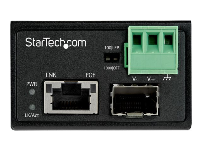 Ce convertisseur de média fibre PoE avec Open SFP constitue un moyen simple et économique d''étendre la portée de vos périphériques de données et d''alimentation à des emplacements distants via votre réseau sur fibre, en utilisant le SFP de votre choix. Il combine la connectivité de données d''un convertisseur de média aux capacités d''alimentation flexibles d''un injecteur PoE